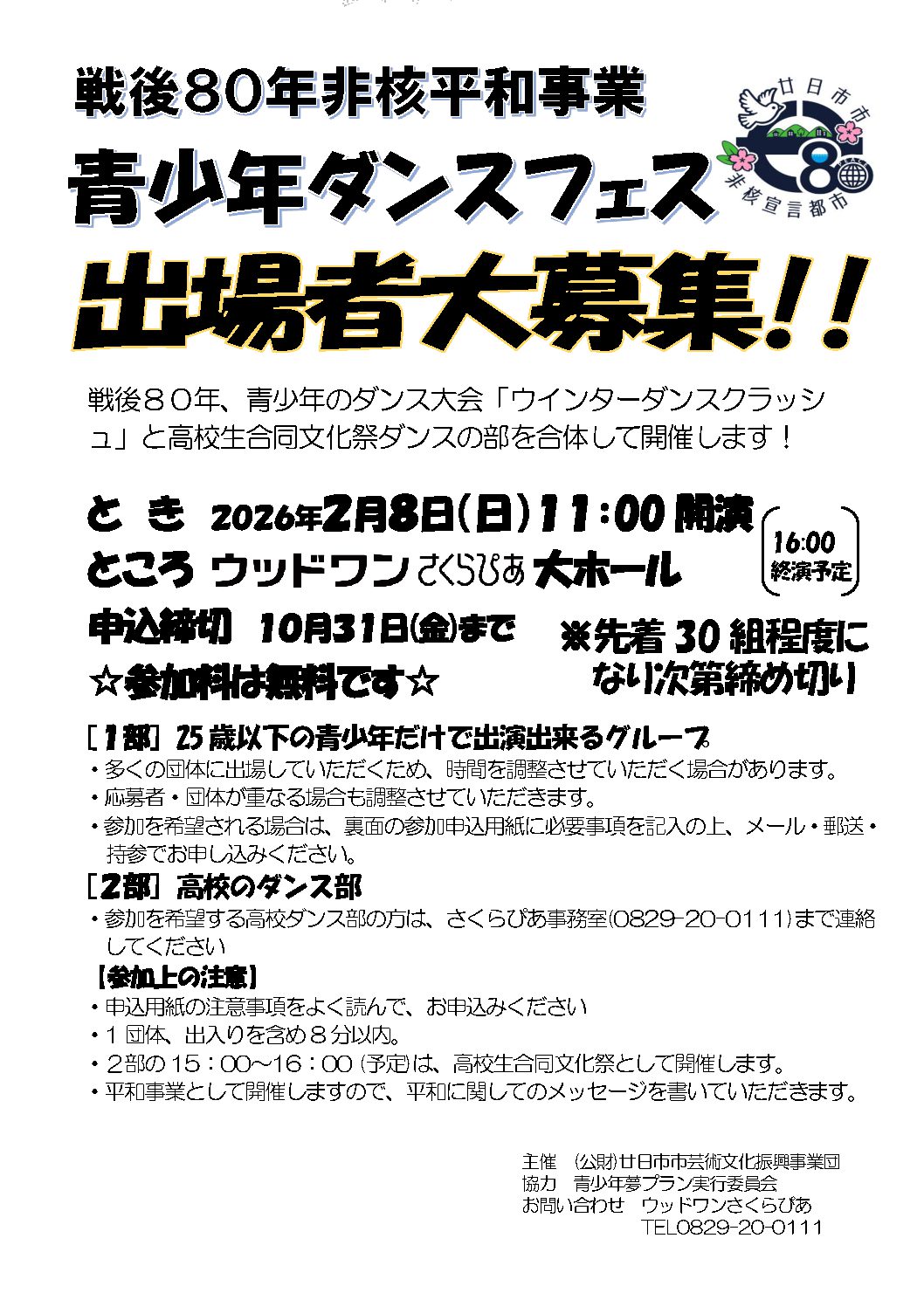 戦後80年非核平和事業 青少年ダンスフェス 出演者大募集!!2026年02月8日(日)